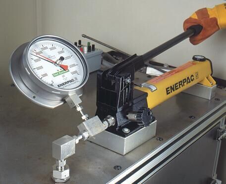 裝有T-6011L系統(tǒng)測試用壓力表的恩派克手動泵用來證實液壓閥的壓力測試