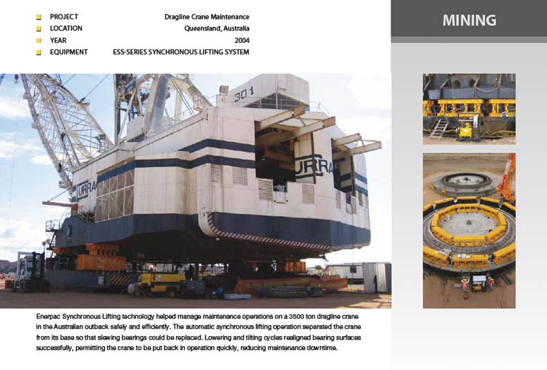7月份,在鮑文盆地卡勒煤礦,G&S工程服務(wù)公司利用PLC控制的Enerpac同步液壓升降系統(tǒng),成功地同時控制80個用于提升索斗挖掘機(jī)的具有100噸升降能力的液壓缸。