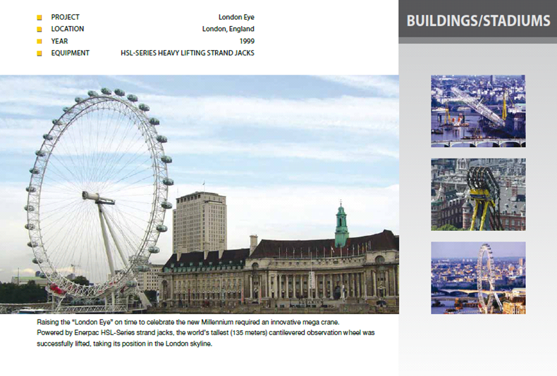 準(zhǔn)時(shí)安裝用于慶祝新千年的“倫敦眼”需要一臺(tái)創(chuàng)新的超級(jí)起重機(jī)。Enerpac 系列 鋼索千斤頂, 成功地安裝了這座世界最高(135 米)的懸臂式摩天輪,使其聳立于倫敦的天際線中。