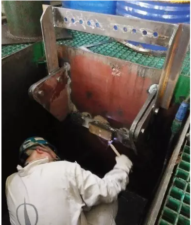 車間設(shè)計制作了一套液壓油缸固定專用工裝安裝于鉗工作業(yè)區(qū)的地坑內(nèi)。不用時,鉸接機構(gòu)打開,工具旋轉(zhuǎn)放入地坑內(nèi),并蓋上格柵。使用時,將地坑的格柵打開,上部固定槽鋼從下面翻到上面,將液壓油缸吊入地坑內(nèi),液壓油缸耳環(huán)插入固定耳板中,耳環(huán)孔內(nèi)插入銷子,將上部固定槽鋼和下部固定槽鋼同時用螺栓收緊。底部同時有一層摩擦材料,通過槽鋼、摩擦材料及下部耳孔的銷子共同固定,使得液壓油缸既不會擺動,也不能轉(zhuǎn)動,以方便液壓油缸螺母的拆松和液壓密封件的更換。