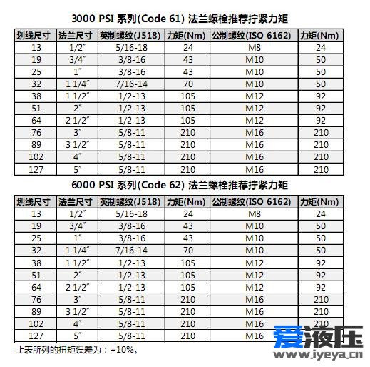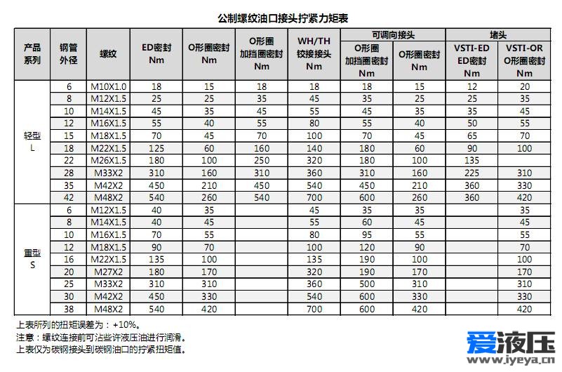 1、公制螺紋油口接頭擰緊力矩表
