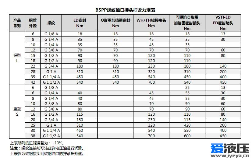 液壓接頭在安裝過(guò)程中,如果擰緊力過(guò)大,會(huì)導(dǎo)致金屬永久變形,導(dǎo)致泄露,如果擰緊力過(guò)小,在高壓下也會(huì)泄露,因此液壓接頭在安裝時(shí)應(yīng)嚴(yán)格控制擰緊扭矩,下面是常用液壓接頭的擰緊扭矩推薦值。