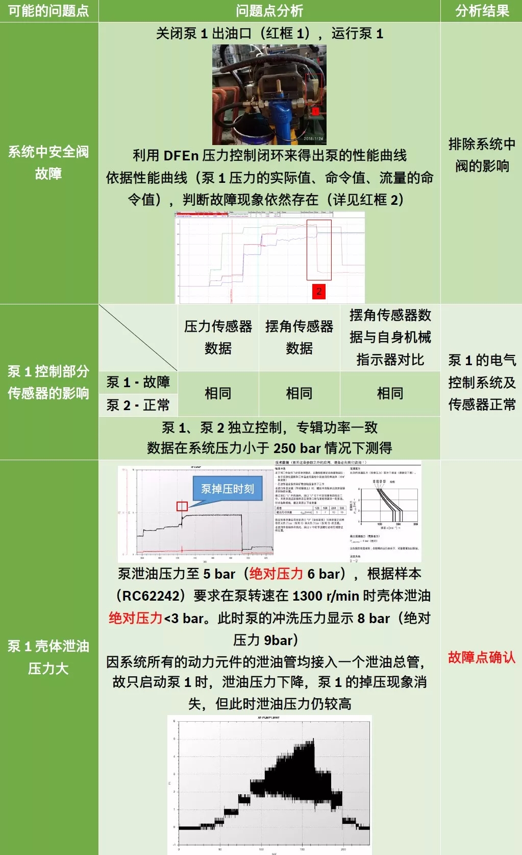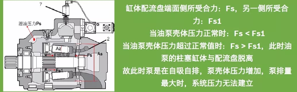 可以肯定泵1的掉壓現(xiàn)象是由于殼體壓力大導(dǎo)致。但掉壓時泵1的排量不降反升,我們不禁要問這么多流量的去處,以及泄油壓力為何還是偏高,可得原因如下: